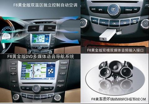 F6黄金版不仅外观设计大气稳重,在配置上也是精益求精,注重丰富实用性,不仅提供了很多舒适性配置,也添加、优化了部分电子设备。F6黄金版配备了倒车雷达、防静电鲨鱼鳍天线、多功能豪华方向盘、双层双模电动天窗、双温区独立控制自动空调、中文八方向显示防眩目内后视镜、NAVI语音导航系统等众多高端配置,更显高档、舒适。近期新增加的F6黄金版2.0 CVT车型还增加了三色显距倒车影像监视系统,使驻车更方便,带给驾驶者从容尊贵的驾驶感受。