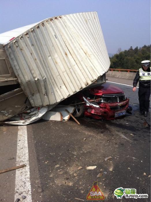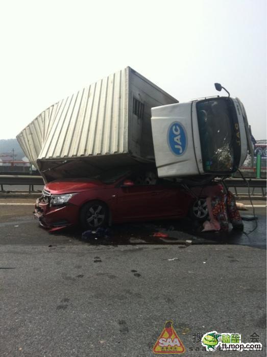 在佩服科鲁兹车主处惊不乱的超级淡定精神之外,我竟然有点不敢相信,被厢式大货车翻身压在下面的科鲁兹竟然能够把车主保护得完完整整,太不可思议了。