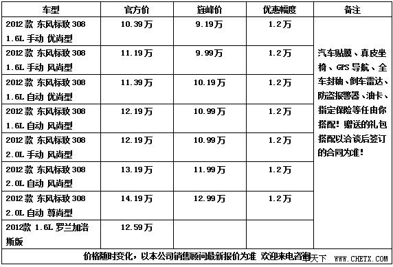 近日,笔者从上海地区经销商了解到,目前308全系优惠1.2万元,最低仅售9.19万元,另外还送一些装潢大礼包(汽车贴膜、真皮坐椅、GPS导航、全车封釉、倒车雷达、防盗报警器、油卡、指定保险等任由你搭配)。具体各款车型的报价及优惠情况请参照下表。汽车报价行情实时更新,文中价格仅作为近期上海地区的售价参考,敬请关注!
