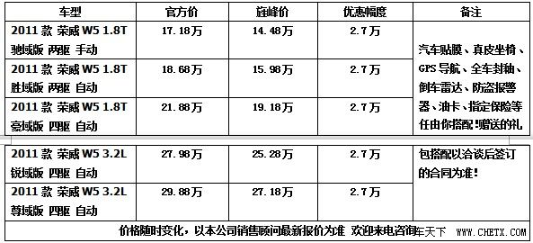 近日,笔者从上海地区经销商了解到,目前W5全系优惠2.7万元,最低仅售14.48万元!另外还送一些装潢大礼包(汽车贴膜、真皮坐椅、GPS导航、全车封釉、倒车雷达、防盗报警器、油卡、指定保险等任由你搭配)。具体各款车型的报价及优惠情况请参照下表。汽车报价行情实时更新,文中价格仅作为近期上海地区的售价参考,敬请关注!
