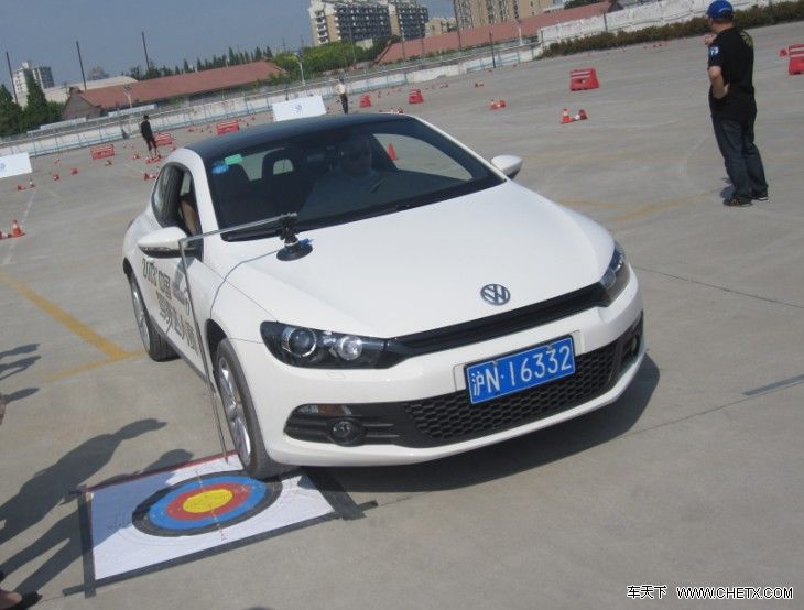 在运动项目中,驾驶员从起点绕个U型弯之后,进入定点的停车目标中。车身上的这跟硕大的“指针”就是定点停车项目唯一的评判标准。指针指在地面上靶面上哪个圈内,参赛者就要被扣去相应的秒数。