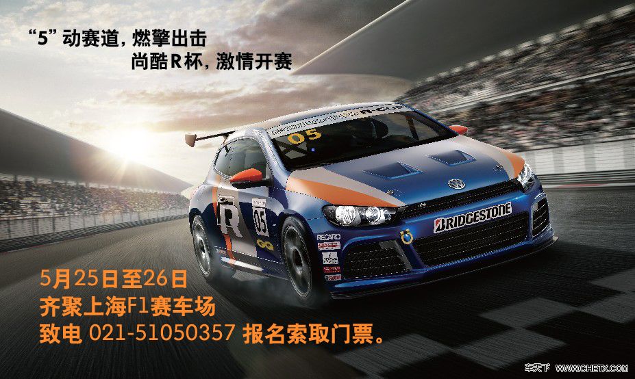 大众汽车尚酷R杯贯穿5月到10月,2013年5月25日至26日齐聚上海F1赛车场。 巅峰之战,领衔开战!顶级赛事,岂容错过?5年经典赛事,用加速度追赶激情,用超越突破无数极限!用不断刷新的记录见证精彩时刻!亲临现场,听尚酷R的嘶吼狂啸,直击赛况“竞”心动魄!敬请搜索并关注上海中进众旺官方网站及官方微信、微博,或致电021-51050357(9:00—17:30),更有机会索取门票。