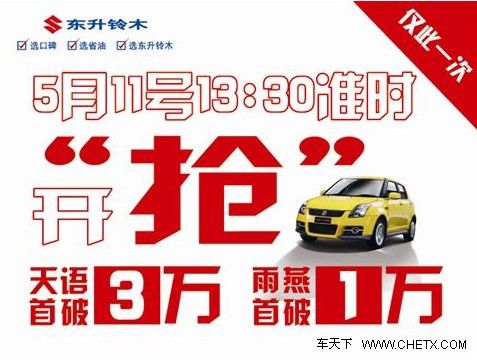 | 立享底价 抓住此刻!5月11日1:30分,大连东升铃木店全系限时特卖会准时开“抢”!预约报名就享专属好礼,天语最高综合优惠首破3万!雨燕最高综合优惠1万!尚悦导航版综合优惠1.7万!试驾礼、订车礼、签到礼;礼遇不停,超级版雨燕大连地区震撼上市,现已登陆展厅,购超级雨燕还将加送3000礼包,本次优惠力度空前,仅限一小时,恰逢母亲节,东升铃木为了全天下的母亲准备了多款超值好车,现车特卖一口价、购任意车型参与金花四溅幸运抽奖,100%中好运,劲爆价格,惊喜连连,让您五月满实满载,再“赚”一把,本周六,就来东升铃木“抢”车喽!