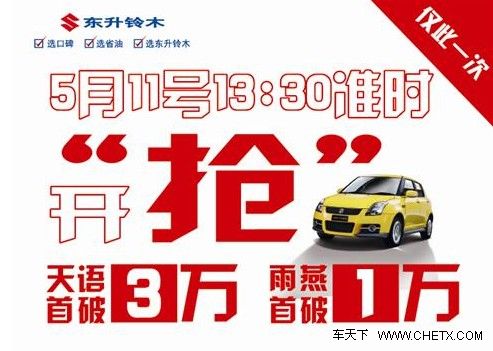 超级雨燕本月登陆滨城,东升铃木购超级雨燕加送3000礼包,团购有惊喜,新车更给力!(以上所有优惠政策均在活动时间内享有,逾时恢复展厅政策,把握购车良机,蓄力五月购车季!)