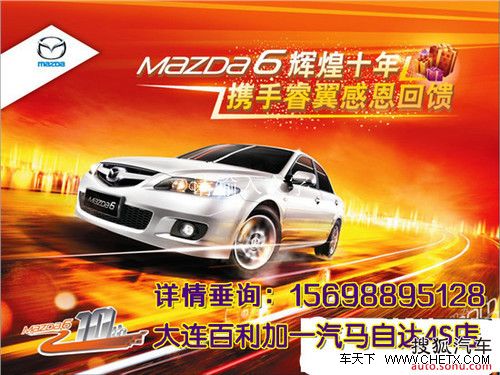 大连百利加一汽马自达,感恩十年携手全系车型疯狂巨献,再送九重大礼,就能把车开回家。2.0黄金排量,首购首选! 马自达6 !报名热线:销售顾问小兰:15698895128(打电话购马自达6当日订车的客户还有好礼相送)