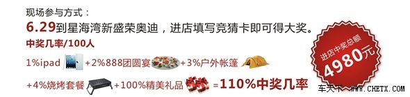 现场不止“猜底赢ipad”,还有更多豪礼等着你。让您在购车享受特惠的同时,888元的全家宴等您来抽取,享受和家人在一起的欢乐!