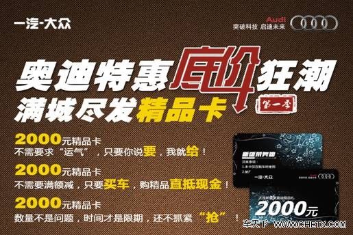 6月29日大连新盛荣开启奥迪特惠底价狂潮,当日现场活动气氛热烈,现每日都有不少市民前来圆梦购车,我们的原则是“促销力度不变,全系车型6.9折起,最高直降22万,购车即送8万大礼包!!”而且从即日起更推出2000元精品卡广发大连市民,您只要到店拿出精品卡任何样式,都可享购车即送2000元精品。