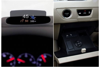 如果你选择的是508顶配车型,按下一键启动按钮后,车辆启动,同时在前风挡下方正对方向盘的地方会升起一个彩屏,正是508主打高科技配置的VTH(即Vision Tete Haute)彩色抬头显示屏,该系统用彩色信息显示目的地导航指示(比如转弯提示、距离提示)、车辆设定的自动巡航速度、瞬时车速等等。这套源于航空科技的抬头显示系统在1975年由法国Dassault飞机公司首先使用在Mercure飞机上,目前在同级车型中几乎鲜有配备,以往仅配备于BMW650i等部分豪华车型。有句话说的好:“包子有肉不在褶,螃蟹有料在拥有”,消费者吃上了才能回味。配置清单上的字母数字文字组合远不如亲身接触,体验后你才知道。