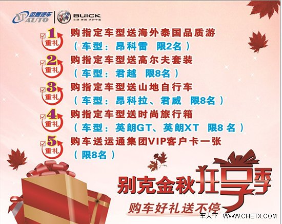 为迎接别克金秋狂享季,特此推出购车优惠好礼相送活动。感兴趣的朋友可以到店内了解。
