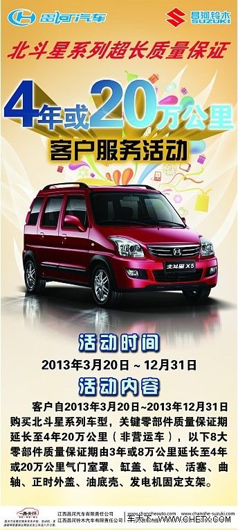 贴心服务,品质保证!从3月20日到12月31日购买昌河铃木北斗星系列车型,关键零部件质量保证期延长至4年或20万公里(非营运车),以下8大零部件质量保证期由3年或8万公里延长至4年或20万公里气门气罩、缸盖、缸体、活塞、曲轴、正时外盖、油底壳、发电机固定支架。