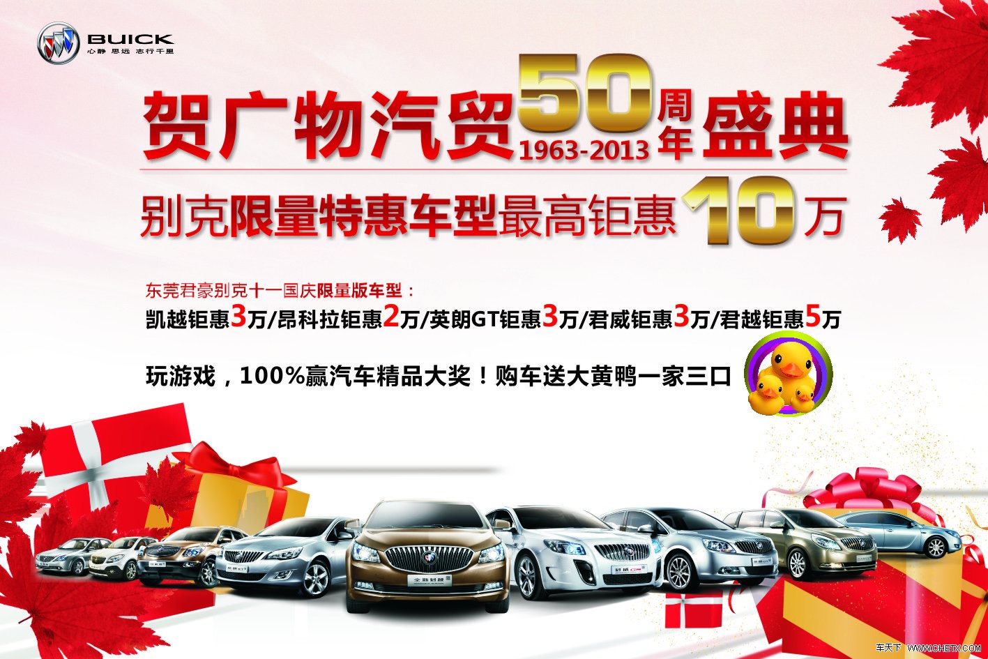 【别克金秋,共享盛会】一年一度的购车黄金时间已经来临,作为广物汽贸旗下第38家连锁4S店:东莞君豪别克可谓“双喜临门”,广物汽贸50周年盛典活动正在举行,借此机会特推出别克限量特惠版车型:【凯越钜惠3万/昂科拉钜惠2万/英朗钜惠3万/君威钜惠3万/君越钜惠5万】,参与互动游戏,100%赢汽车精品大奖,订车大黄鸭公仔(一家三口)带回家!