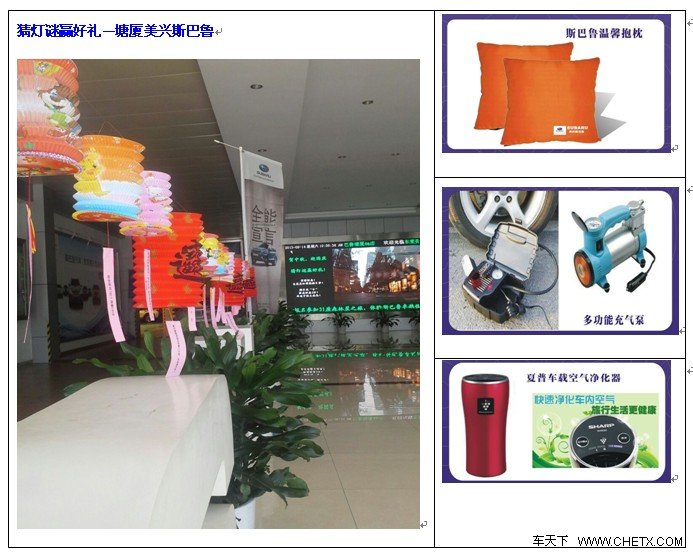 到店的客户即可参与“猜灯谜赢好礼”环节,更可获得温馨抱枕、多功能充气泵、进口车载空气净化器等等斯巴鲁限量版的精美礼物。