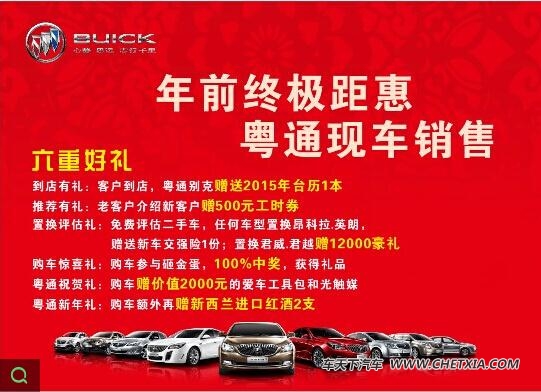 这些,将都不是您的障碍。粤通别克年前重磅出击,特别呈献年前终极钜惠活动,以充足的现车和丰厚的豪礼让您畅享欢乐购。到店即可获赠2015粤通别克专属台历一本;购车最高现金优惠50000元;置换君威、君越尊享12000元豪礼;惊喜不停送,购车还赠送价值2000元爱车工具包及新西兰进口红酒2支。全车系史无前例年前促销放价再掀狂潮!心跳等待,一触即发!赶快行动吧!