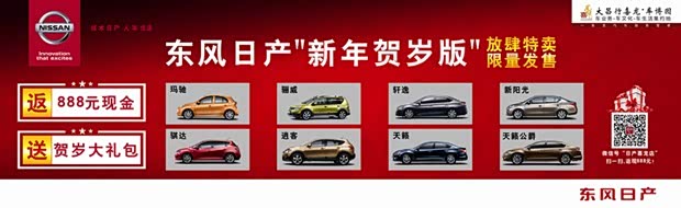 扫微信,送红包!元旦期间凡到店客户关注“日产喜龙专营店”官方微信即有机会领取喜龙新年大红包,100%有礼!购车尊享6888元跨年大礼包、8888元特权大礼包,助你购车上牌无烦恼!活动期间推出“东风日产新年贺岁版”车型限量发售,寒冷的天气,温暖的价格!一切尽在日产喜龙专营店!