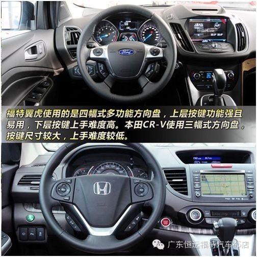 本田CR-V方面,采用的是三幅式方向盘,也使用了多层布局的多功能按键设计,其中表面的按键设计我们在现款思域上也见到过,让人联想起游戏手柄,操作感受也非常不错。下层按键由于设计简洁而且按键尺寸较大,上手难度要低于福特翼虎。