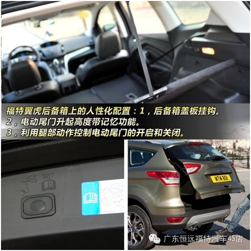 另外不得不提到福特翼虎的几个人性化配置,第一是后备箱地板有一个挂钩,可以悬挂于车体结实的部分,方便拿取盖板下方的备胎等物品;第二是后备箱采用了电动尾门,开口较大,而且开启高度可以记忆,对于身材不高或在地下车库使用的人来说,电动尾门可以不开到最大角度的功能,非常实用;第三是用腿部动作可以开启电动尾门,只需要将腿在后保险杠下方晃一晃,尾门就会打开,对于搬运重物的人来说非常实用。