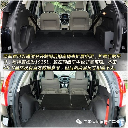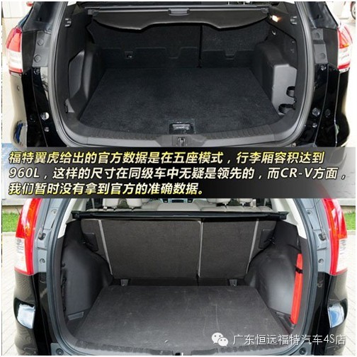 两车都可以通过分开放倒后排座椅来扩展空间,扩展后的尺寸,福特翼虎为1915L,这在同级车中也是一个非常可观的空间,这样的容积应付一些搬运任务也是不在话下。本田CR-V放,同样我们暂时没有拿到官方数据。