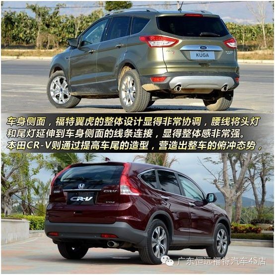 福特翼虎的外观显得非常动感,延续了近年来福特车型追求动感的设计理念,看上去就像是加高了的福克斯,而且设计细节也精打细算,可以说这个造型设计非常成功。本田CR-V现款车型是刚刚经历了换代,相较于老款车型,新车的外观显得更加硬朗,但它并没有试图显得多有运动气息或野性的感觉,它仍然坚持城市SUV的路线,从设计语言上显得更加外扩,使得整车显得更宽大饱满。
