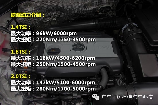 途观则搭载了三款排量发动机,也都是无论增压车型,排量从1.4L到2.0L不等,匹配的是6速手动或Tiptronic6速手自一体变速器。