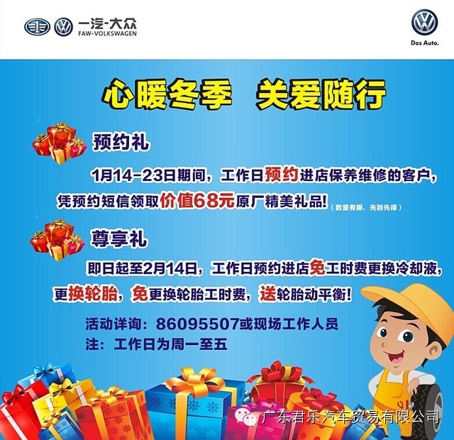 这些问题虽然看似微小,但如果不加以留心,很容易为车主的出行造成不便,严重时甚至会影响行车安全。冬季是车辆养护的重要时期,为了保证您的爱车今年冬天行车加倍安全及减少您的等待时间,现广东君乐举办“心暖冬季 关爱随行”活动,为您解决后顾之忧!活动详询:020-86095507