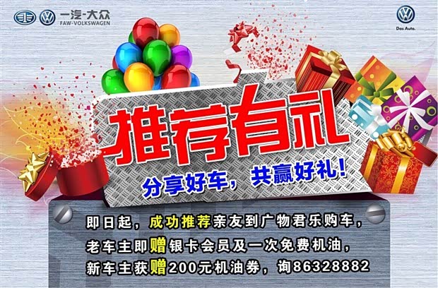 新年新礼享!即日起,广物君乐车友分享好车,推荐亲朋好友到我店购新车更可享受新年特惠回馈礼!