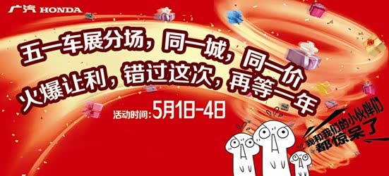 五一您是否还打算在车展瞎逛?汗流浃背地到处看车也还是选不到合适的车子!别浪费时间了,到广汽本田合骏店来吧,五一小长假琶洲车展分会场,同一城,同一价!您可以吹着空调喝着饮料享受五一购车期间全场火爆大让利,全城最低价,到店礼、财神礼、特价礼、飞度礼、置换礼、金融信贷礼、介绍礼、无忧礼,礼礼相待,错过这次在等一年!