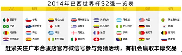关注广汽本田合骏店官方微信账号并转发当天活动信息到朋友圈后,发送您心中冠军球队名称+本人姓名+手机号(活动中奖通知用)到广汽本田合骏店官方微信即可,7月15日与微信公布猜中及抽中的客户名单中,最高可获足球游戏桌一张!
