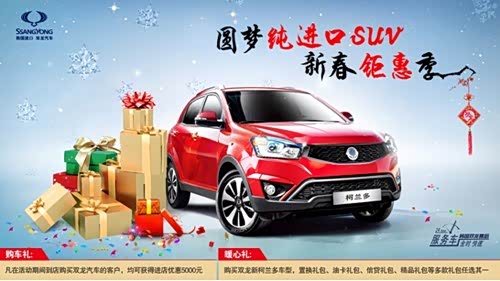 2014年12月20日—2015年2月28日,双龙“圆梦纯进口SUV 新春钜惠季”正式启动。活动期间,凡到店看车、选车、试车即赠精美好礼;购全系任意车型享现金直降5000元“购车礼”优惠;购新柯兰多再加“暖心礼”一份,置换礼包、油卡礼包、信贷礼包、精品礼包等任选其一,累计优惠万元以上。