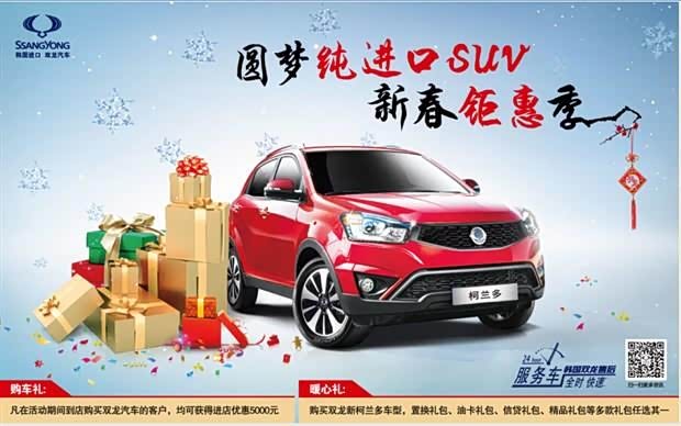 即日起至2月28日,双龙“圆梦纯进口SUV 新春钜惠季”活动,邀您来享累计1万元优惠幸福