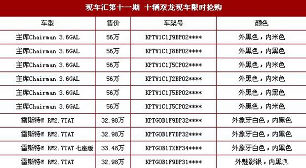 本次活动,双龙主推沉稳大气的主席加长版和极具越野性能的雷斯特W,其中主席让利高达13万元,总计回馈额度达到百万元。据介绍,这是双龙2015年电商新春钜惠第一波,接下来将有更多新型电商合作模式上线。(限时抢购车型见下图)