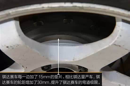 穿上运动包围底裙的小D,有着温顺的外表、简单中控台。同时,在轮圈的内侧法兰盘这里,骐达赛车每一边垫了15mm的垫片,骐达赛车轮距增加了30mm,提升了骐达赛车的弯道极限。简约而不简单,勇者一较高下!