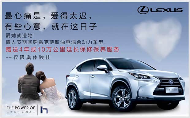 爱她就送她!情人节期间购雷克萨斯油电混合动力车型,赠送4年或10万公里延长保修保养服务—仅限奥体骏佳!