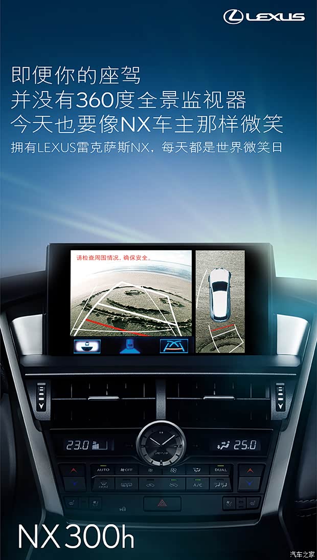 NX300h搭载的360度全景监视器由带4个摄像头的摄像系统和可显示全景图的控制单元组成,以鸟瞰图方式把前方、两侧及后方画面清晰地呈现在高精度显示器上,帮助驾驶者查看车辆周围情况。驾驶者只需启动发动机,按下全景监视器开关即可对车辆周围环境一览无余。
