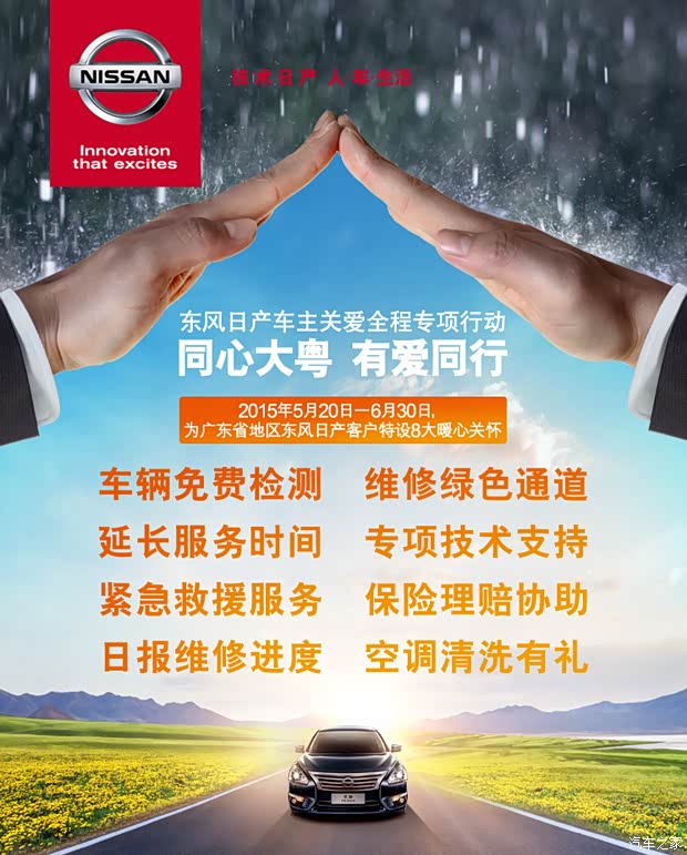 近期内广州地区普降特大暴雨,相信很多客户的爱车受灾严重,东风日产迅速应对自然灾害,及时关爱我们的车主。现特针广州的所有车主发布关爱全程专项行动: