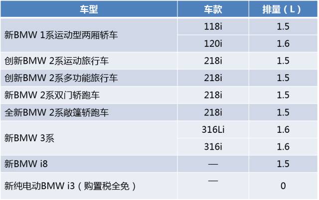 9月29日,国务院发布最新消息,自2015年10月1日到2016年12月31日,对购买1.6升及以下排量乘用车实施减半征收车辆购置税的政策。而这一次,作为汽车行业可持续发展的领军企业,BMW诚意满满地带来符合该项政策规定的十款车型,TA们分别是: