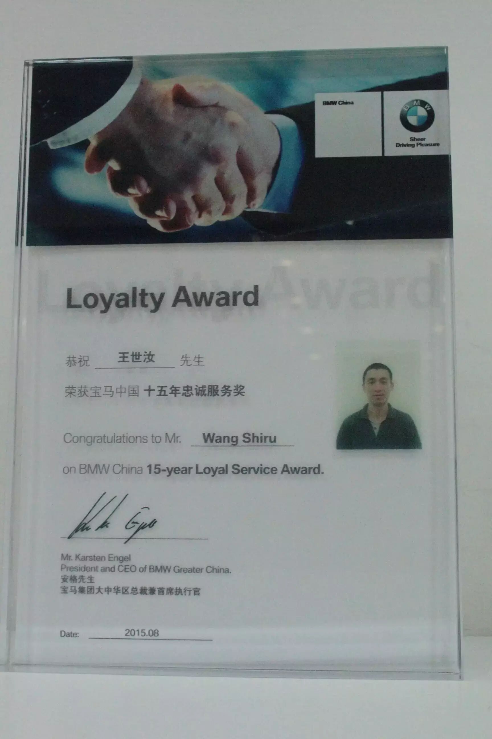 2016BMW南区第一季度经销商大会在山水甲天下的桂林市隆重举行。广州昌宝技术主管王世汝先生荣获“宝马中国十五年忠诚服务奖”!