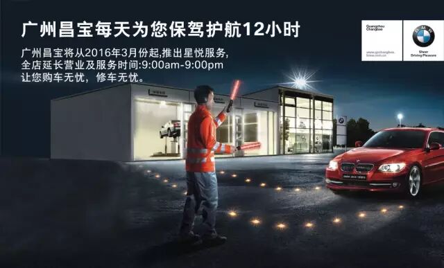 白天奔波在商界,无暇顾及爱车的保养?白天忙于洽谈业务,想置换台新车又没时间挑选?我们广州昌宝开展星悦服务可以为您解决这一系列的烦恼,我们每晚在这里等候您...... 如需延长等候时间,请您提前致电通知我们。